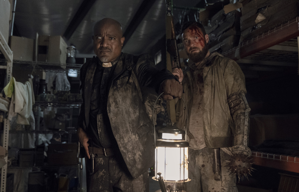 Aaron uses his super hand to try and break into a store, while searching for supplies. I’ll give them props here, they got me! We are treated to a jump scare, as a bunch of Walker arms coming through the cracks in the door. It was nicely done! Gabriel fights back by cutting off their arms, and then comes the second ‘gross out’ moment of the episode, as the duo try to pull a Walker out of the door, but instead of pulling its arms off, the skin just comes off and the two hit the deck. Again, gross! As their search continues they find the skeletal remains of a couple on a mattress, they died head on head, showing a loving embrace. Again those slow, sorrowful musical notes of the guitar evoke so many emotions. The music is definitely the MVP of the episode so far!