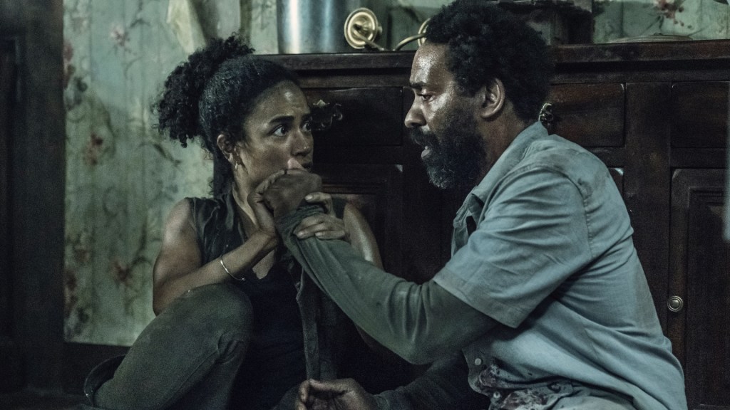 At the house, Virgil does a sweep and deems it secure and tries to get Connie to get some rest, but she refuses. Connie explores the house herself and spots an eye looking at her from behind the wall, which sets her off in a panic. Now, at this point it’s hard to say if it was really there or if this is some sort of trauma, which had already been hinted at. Now, I say that, but before I can finish that thought, a door slides in the hallway, separating Virgil and Connie. It’s all gone a little House on Haunted Hill hasn’t it? I loved how silent these scenes were, and it made what happened next ten times scarier! Connie feels the rumbling and all of a sudden, the silence breaks and some sort of crazed Gollum man scrambles along the floor chasing her. At the time, my gut feeling was a crazed-person rather than a Walker, given the way they moved. This was a fantastic horror sequence and just like everything else inside the house, it was genuinely scary. Still being chased, Connie ends up in the walls – and with see another eye, but this time get a much stronger indication that she is having trauma flashbacks on top of the crazed man crawling around the place. The next terrifying sequence see’s Connie banging at Virgil from behind the wall who, with his back turned, does not see the crazed man slowly entering the frame from the floor, subsequently attacking Virgil. The man shouts that he’s hungry, but before he can grab a bite, Virgil stabs him and the man crawls away.