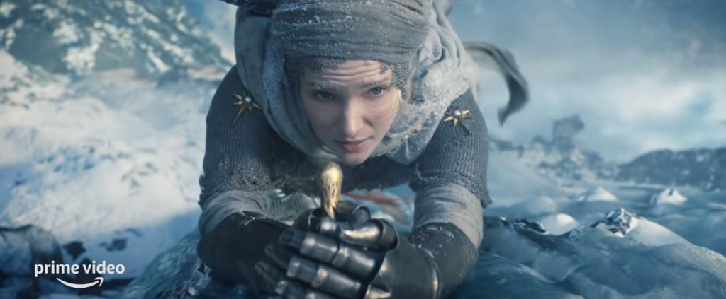 We see Galadriel (Morfydd Clark) scaling a mounting. Could this be Helcaraxë? The ice wasteland that bridges Aman and Middle-Earth? Maybe, maybe not, but as a visual, it just has so much scope and scale which looks incredible. While obviously much younger here, Galadriel is still several thousand years old, but it will be interesting to see how comparable she is to the character played by Cate Blanchett or if those traits are developed throughout the series. I like that it appears that she is set to take a proactive role in the story and the impending threat of Sauron further down the line.