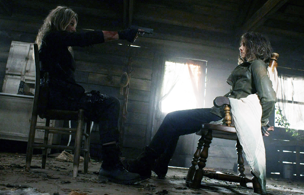 Daryl’s group encounters Leah’s camp and once Daryl realises that Leah is involved, you see the urgency change on his face! Leah catches up with Maggie and the pair fire off multiple shots at each other. Maggie manages to hit Leah in the leg, but before she can capitalise on her temporary victory, it is snatched away from her, as Leah attacks her from the side, knocking Maggie out cold! Morning has arrived and Maggie awakens to find herself tied up in Leah’s old cabin and at gunpoint. Maggie talks through the situation and what Leah is feeling, having first-hand knowledge of what it feels like. Leah tells Maggie that it’s not just her she wants dead, but everyone she knows and loves! Family for a family. Maggie gets Leah to a boiling point, while all the time loosening her bonds. She attacks Leah and the pair face off in a brutal and tense knife fight! Leah manages to get the upper hand and starts to beat Maggie’s face into a pulp. A gunshot sounds and Leah is shot in the head. Daryl is at the door with his gun raised. Hmm. I think I would have preferred Maggie to have resolved this conflict, as the pair had such a great fight, it didn’t need ‘a man to save the day’. But given Daryl’s own history with Leah, I can let that one slide. There is no time to dwell, however, as Lance and his men arrive! Daryl shoots toward them and manages to cut open Lance’s face, much to his anger. But if anything, this just gives him more focus and speeds up the next stage of his plan…
